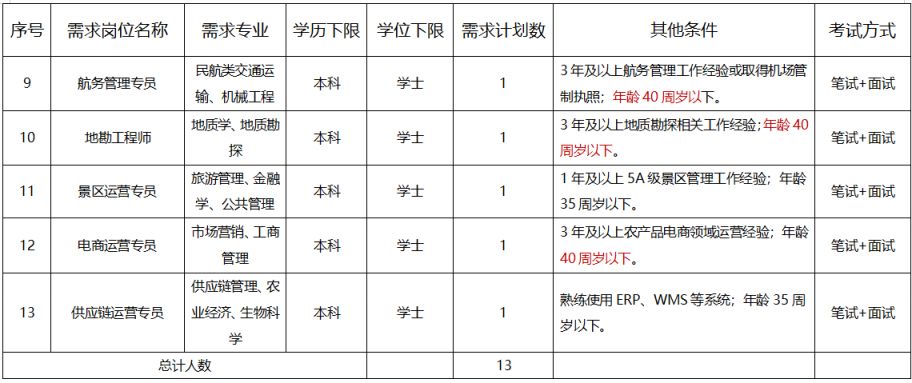 本次面向社会公开招聘13人,具体岗位及相关要求详见附件1(郴州市国资控股集团有限公司员工招聘岗位信息表)。