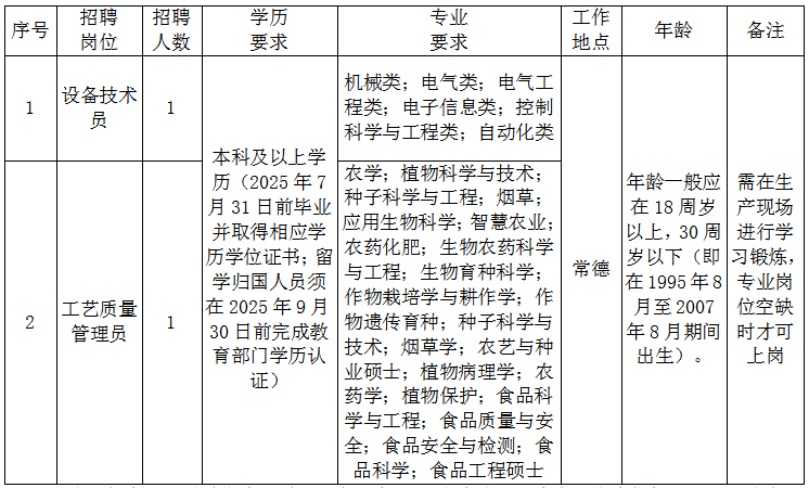 根据发展需要,常德芙蓉烟叶复烤有限责任公司拟公开招聘2人,招聘计划如下: