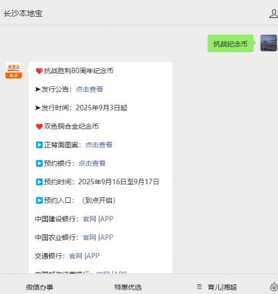 温馨提示:扫描下方二维码前往【长沙本地宝】,关注后在对话框回复【抗战纪念币】即可获取2025年抗战胜利纪念币,纪念钞发行公告、图案、面额、规格、材质及发行数量等相关信息,还可查看预约安排、可预约银行、发行量、预约指南等相关信息。